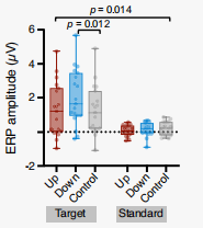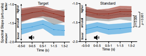 实验3将瞳孔生物反馈与脑电相结合,研究瞳孔自我调节如何影响目标音调的谱斜率和P300事件相关电位(ERP)成分,这是蓝斑(LC)活动的电生理标志物。研究假设瞳孔缩小(蓝色)时的斜度比瞳孔放大(红色)时的斜度更陡,并进一步研究斜度是否会随着目标色调的变化而变化。此外,研究假设当受试者在目标音调之前瞳孔缩小(蓝色)时,P300会比瞳孔放大(红色)时更大。图4中的声音图标代表在oddball任务中播放的标准(浅灰色)和目标音调(深灰色)(图4)。