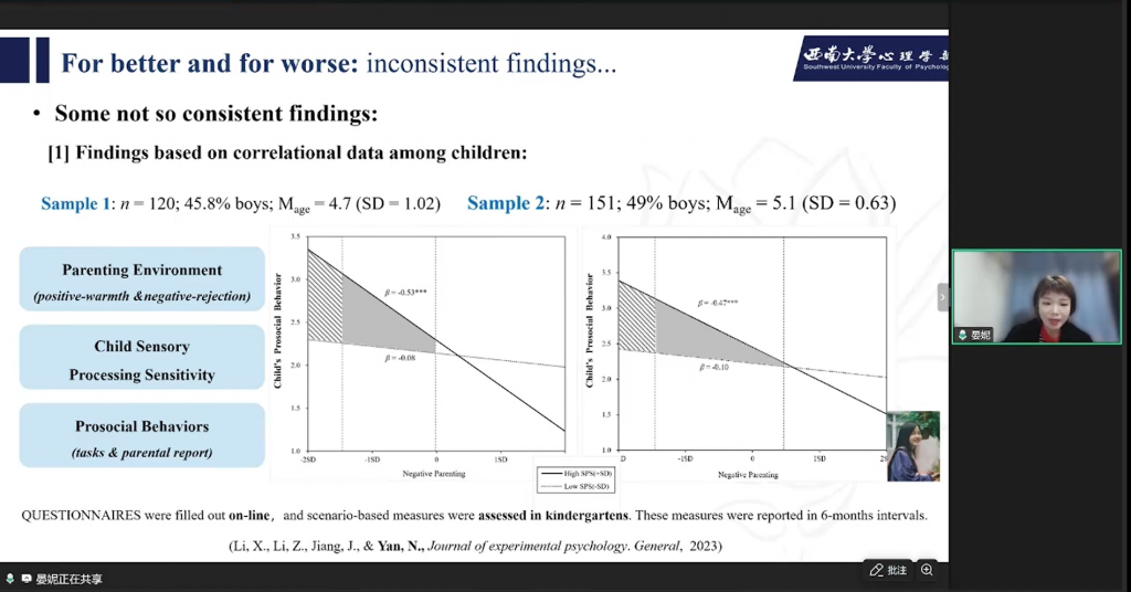 但晏妮教授实验室及其他相关研究却出现不一致结果:3-6岁幼儿对家庭持续教养行为无显著交互反应,仅对消极教养更敏感;观看负性反馈视频后高敏感孩子亲社会意图和持续情绪显著下降,观看持续反馈视频则无明显持续反应;幼小衔接阶段高敏感孩子未表现出更强易感性,大学生群体仅对消极环境/负性事件易感,对持续因素无明显响应。